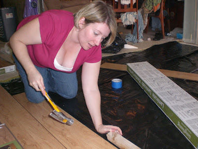 The click lock flooring goes in extremely easy, we got about half of the 500 square feet that we are going to do, done on Sunday, we will finish the rest over the three day weekend. K, who is amazingly industrious for someone six months pregnant did an amazing amount of the work